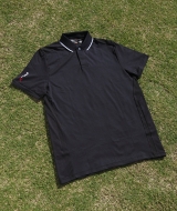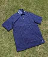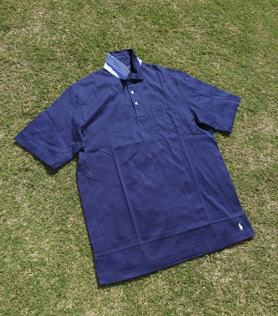 落ち着いたネイビーのポロシャツ。衿裏にチラリと見える、さわやかなブルーのストライプがアクセントに。 (ポロゴルフ)。