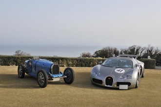希少なBUGATTIの2ショット。左はグランプリシーンを席巻した歴史ある1929年式Type35C。右は宮川さんの愛車、2008年式Veyron。