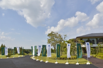 8時を過ぎたころ、クラブハウス前にて恒例の開会式を行った。東急セブンハンドレッドグラブの西ホールは、10日ほど前に富士通レディースが行われたばかりで、ラフ設定などトーナメントのコンディションをそのまま残した状態での開催。アスリート系ゴルファーの方々には挑みがいのあるコースであるわけだ。とはいえ、プレーの上手い下手に関わらず、幅広い方に楽しんでいただくのがこのコンペの方針。タフなプレーが予想されることから進行をスムーズにする特別ルールなども設けられた。