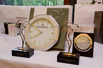 総合上位を表彰する前には、女子の3位から1位までが表彰され、パーティに華やかさが溢れる。こうして盛り上がった最後に発表された、今回の優勝者は、一木勝氏だった。大きな拍手と歓声。トロフィーと共に、副賞として、オーデマ ピゲの置時計とオリジナルキャディバック、さらにパレスホテル東京のエグゼクティブスイート宿泊券(2食・スパトリートメント付)が贈られた。