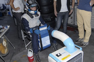 20周目には、路面温度が50℃を超えた。午後2時を過ぎ、直射日光を受けるサーキットは尋常じゃない暑さに。チーフの志村がドライバーチェンジに備え、クールスーツの氷を多くするように指示を出す。