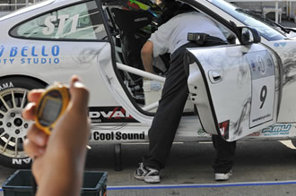 第一ドライバーは佐藤。普段見せる笑顔とは裏腹に、気の強さは並みではない。スタートをガッチリと決め、1コーナーでは後続のランエボ勢を押さえ、ポジションキープの7位。予想されたこととはいえ、後ろからは、GTドライバー達が容赦なく抜きにかかろうとする。スタート直後は、あおられまくりのキツイ展開。それでも抜かさせない佐藤。一度前に出られてしまえば、抜くのはかなりやっかいだからだ。プラン通り41~42秒台でラップを刻む。数周後にはレースペースが42秒~43秒台のランエボは少しずつ離れていった。「最初さえ押さえられれば…」の思惑どおりの展開。