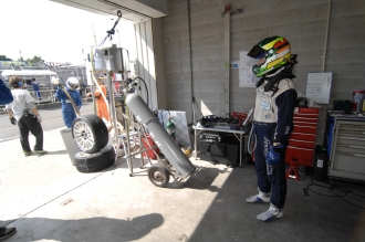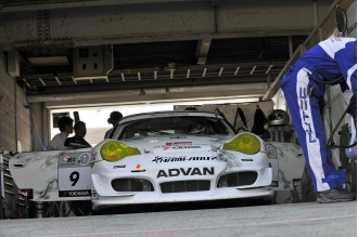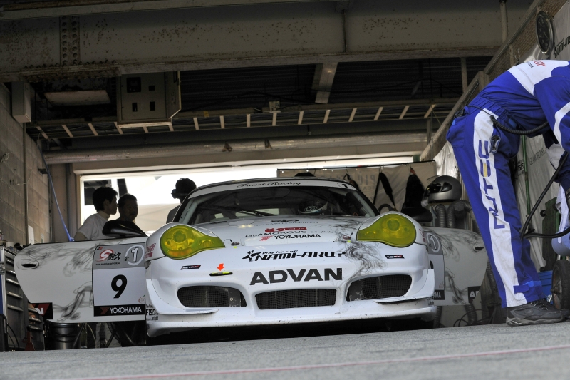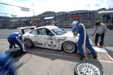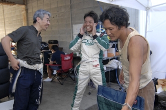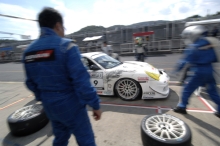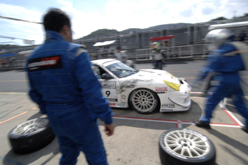 スタート直前、正午には気温が34℃を超え、湿度も60%以上。うだるような暑さは昨年と変わらない。レースで使うマシン、ポルシェ996の調子は良いようで、岡山のコースに合わせ「よく曲がる」とドライバーにも好評価。昨日行われたフリー走行では1回目に1分39秒台、3回目に40秒台と、昨年と同等のタイムを出していた。そのせいかピットの雰囲気も穏やか、マシントラブルが続いた昨年のようなピリピリとした感じはない。