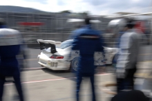 コース上をスローダウン走行しているためピットに戻ってくるまでの時間が長い。タイヤを用意して待つピットクルー。すべりこんでくるFaust.RTのポルシェ。ところが、右リアのダイヤにはバーストの気配がない。それでも異常があるのは確かだ。急いで右リアタイヤを交換する。…が、これがホイルーハブのボルトに入っていかない。2本目を急遽用意しタイヤチェンジ、ピットを離れたのは4分14秒後だった。