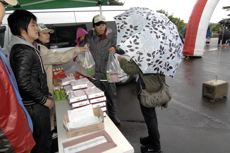 招待内容はサーキット入場券(28/29日)と決勝当日のお弁当、駐車券をセット。メールの応募に限ったものだったが、予想以上の反響で、急ぎ招待者数を200名に増やすことになった。決勝当日はあいにくの雨だったが、当選した方ほとんど全員が来場。受付テントでは、GT選手権にZENTポルシェで参戦している土屋武士選手が、一人一人にお弁当を手渡すというサプライズ。おおいに盛り上がった。