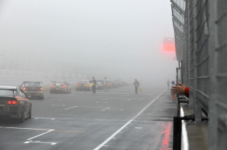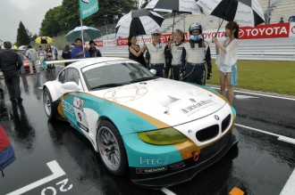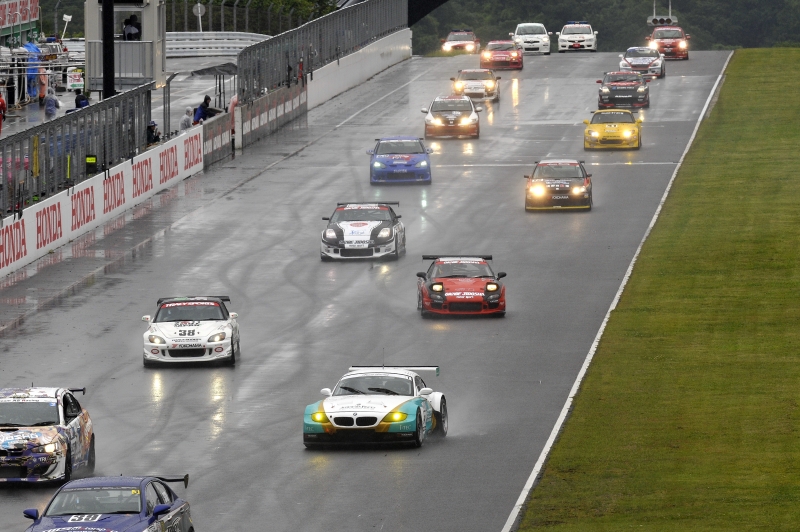 ピットウォークが終わり、いよいよコースイン、決勝のグリッドに付く。雨は相変わらずで、強くなりこそしないものの、やむ気配もなし。路面はウエットでレインタイヤを装着。参加車両はゼッケンに復興支援ステッカーを貼り、スタートを待つ。