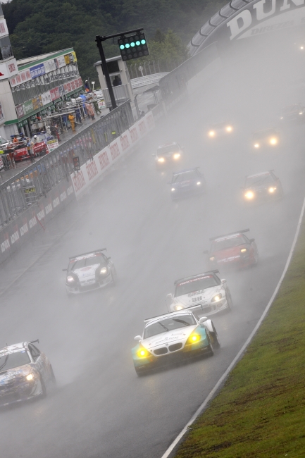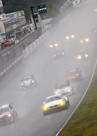 エンジンに火が入り、シグナルグリーン。マーシャルカー先導のまま1周、そのまま停止せずにスタートするローリングスタート。S耐ではおなじみの光景だが、ピット側から見ると先頭車両から2~3台は見えても、後続は水煙の中、爆音だけが聞こえる。