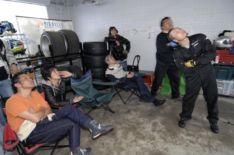 レースクイーン達が主役となるピットウォーク。雨の中、多くの観客がピットレーンを歩く。その裏では、車載ビデオをPCで見ながら、コーチ役の山野が懸命にアドバイスする。コースで答えを出すのはドライバー本人。レース中に対応できるよう、話し合いは熱を帯びる。接地感のないタイヤ、微妙なアクセルワーク、ライン取り、ブレーキのかけ方、すべてが今までと違うのだ。