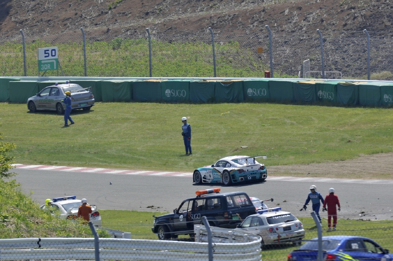 ところが、万事順調そうに見えた直後、後続車の一団が3コーナーで多重クラッシュを起こした。コース上にパーツが散乱し、セーフティカー(以降SC)が導入されることになった。そして、4周目まで行われたSCランの間に全チームの約3分の1がピットストップを行いドライバー交代を済ませた。