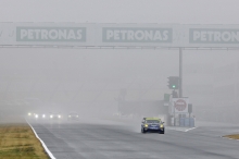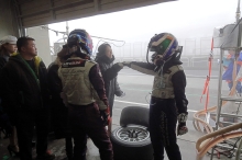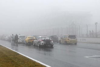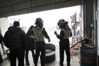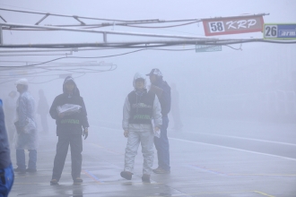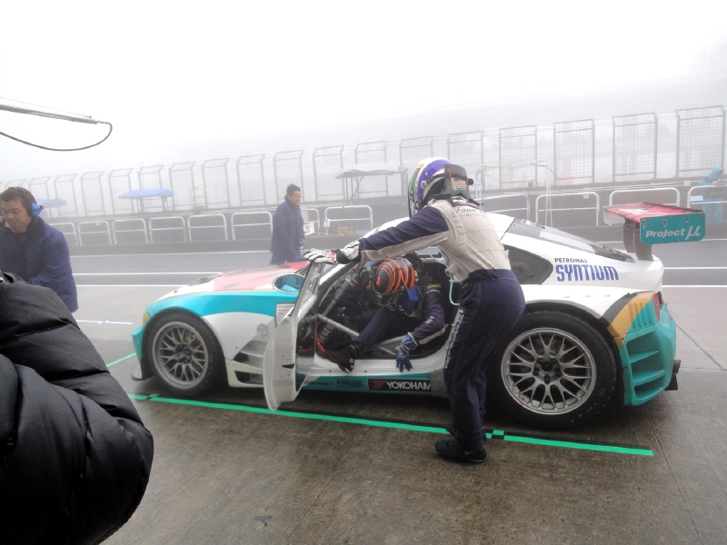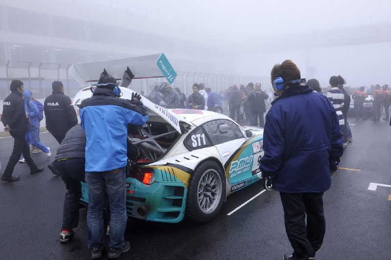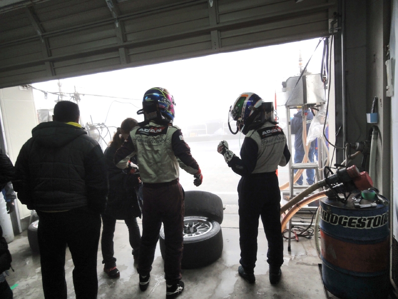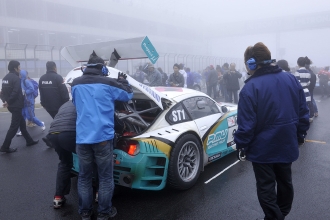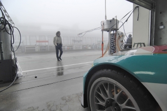 12時20分。10分間のウォームアップ走行は改訂スケジュールどおりに行われた。ところが、そこから霧が急激に立ち込め、12時50分にはかなりの量の雨に。これにより、13時10分からの決勝スタートは見送りとなり、スタートが14時30分に変更、レース時間も3時間から2時間への短縮となった。オフィシャルによる公式通知では、スタートはSC先導によるSCランが2周以上。一人の最大ドライブ時間は80分となっていた。そのため、午前中のシミュレーションは破棄せねばならず、急遽、再度のミーティングが必要となった。