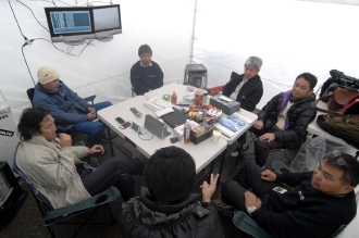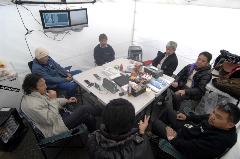 ピット裏のテント内、張りつめた空気の中、ミーティングは進む。結論はSCスタートなら1周目にドライバー交代。その後は幾通りかのシミュレーションに従って、ピット側の千代から無線で判断をドライバーに伝えるという作戦に。ドライバー順は、ドライバー3名の話し合いで決められ、順番は堀、佐藤、岡本となった。