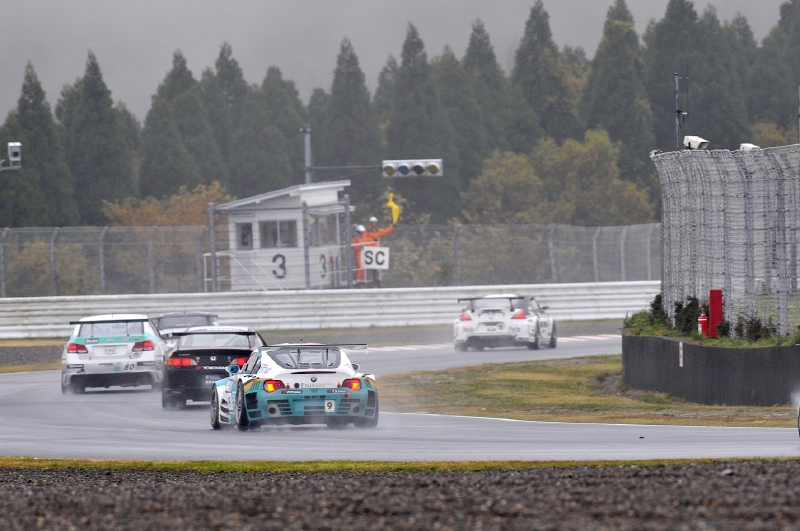 SCリードのもと隊列を組んだまま最低2周以上のSCランが行われる。その1周目の最終コーナー、コントロールタワーに戻ってくる途中、堀がドライブする#9 Faust RTのBMW Z4が動いた。ピットロードに戻ってくるマシン。目の前を走る#3はコース上にステイだ。