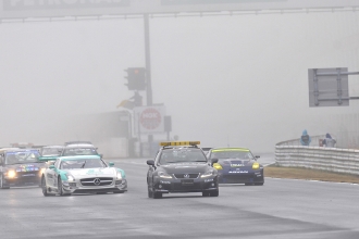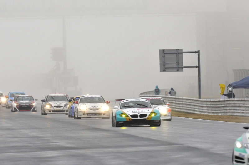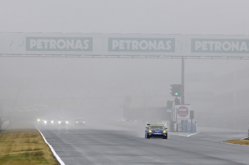14時30分。霧の中での決勝スタート。SCスタートは追い越し禁止だがフォーメーションラップと違い、グリーンライトが点灯した時点でレース開始(時計が動く)となるため、1周目からのドライバー交代が可能だ。