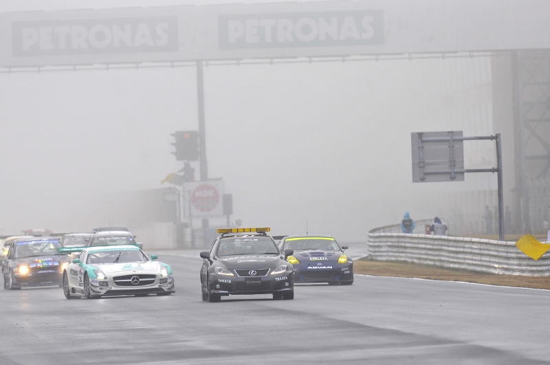 ところが、走り出してたった2周、これからという時に、無情にも再び強い雨がコースを襲う。イエローフラッグで追い越し禁止。嵐のような土砂降りの中、3度目のSCカー先導……。