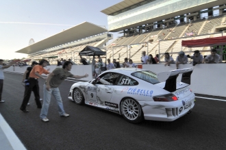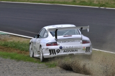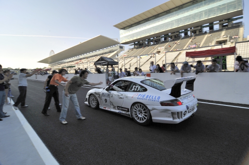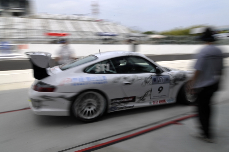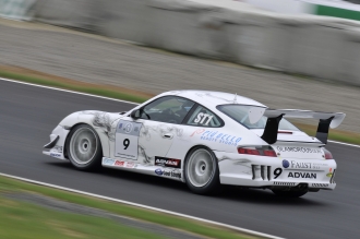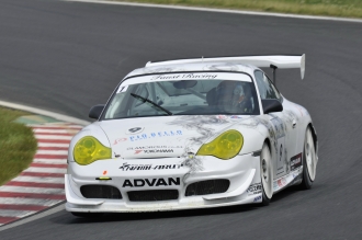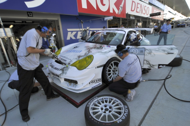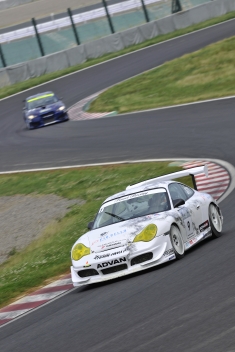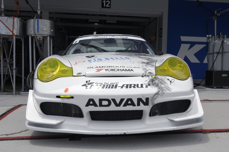 決勝レースは1stドライバーの安藤の、粘りの走行が続く。ストレートスピードの速いポルシェだが、S字からデグナーと続く上りカーブではクラス下の後続 車にピタッと合わされ突付かれていた。予定周回数を終えてピットに戻ってきた安藤はグッショリと汗で濡れている。予想以上の暑さのようだ。