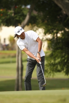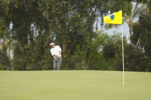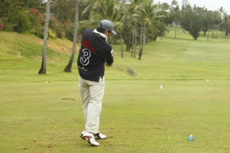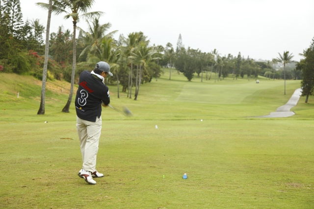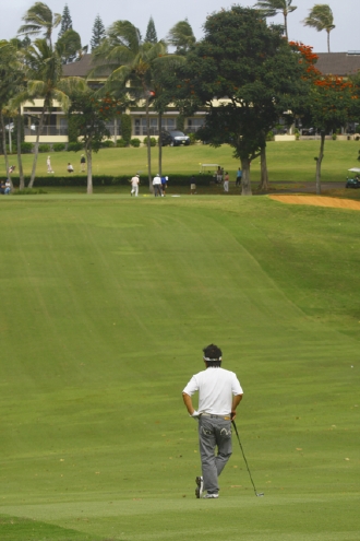大会6日前にハワイに入り、連日ラウンドをこなし、調整してきた。期するものが日焼けした表情からも感じられる。しかし、アプローチとパターがうまくいか ない。あれほど練習し、やれる感触も得たのに芝のクセにうまく対応し切れていない。ホールが進む度に首を傾げるシーンが多くなった。