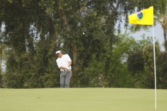 薄雲に包まれていたパールハーバーに蒼空が戻り、明るい日差しがグリーンを照らし始めた。午後12時40分、西林基樹、浅野則之に次いで井上盛夫がホール アウトし、予選ラウンドが終了した。3人のトリを飾った井上は「ふぅ」と大きくため息をつき、「キツかったけど楽しかったよ」と、小さく微笑んだ。真っ黒 に日焼けした表情には、少しばかり疲労の色が見える。雨、風、深い芝という厳しいコンディションの中、自分の思うようなゴルフが出来なかったからだろう。 内々からこぼれそうになる悔しさをグッと飲み込み、カートに乗り込んだ。