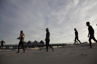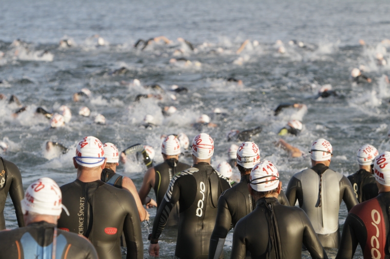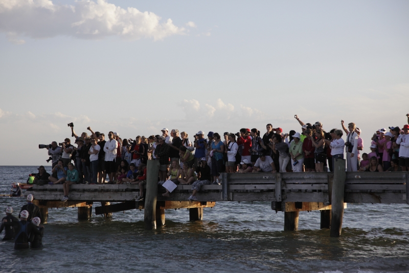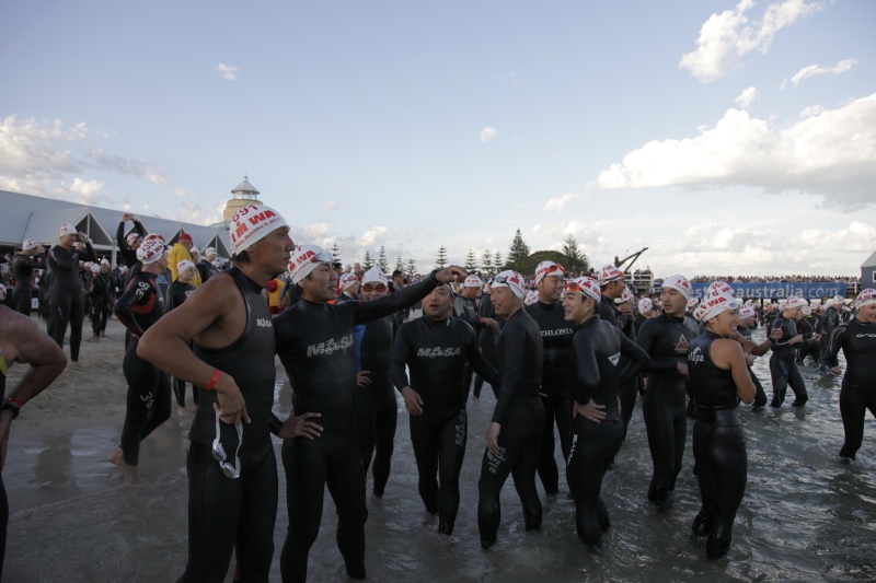 ひざのあたりまでビーチに入っていた1500人もの選手たちが、一斉に水面へ飛び込んでいく。水しぶきが上がり、白いキャップがジェッティーに添って隊列を作っていく。