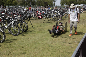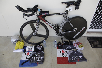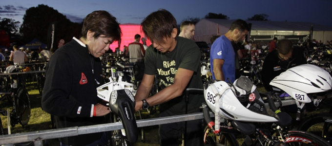 ビーチから戻ると、チェックインへ向かう。バイクとランのギアを、トランジッションエリアにセッティングする。山川も稲本も、エキップメントや装備品はこれまでとほぼ同じものを用意してきた。
