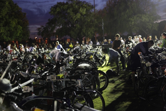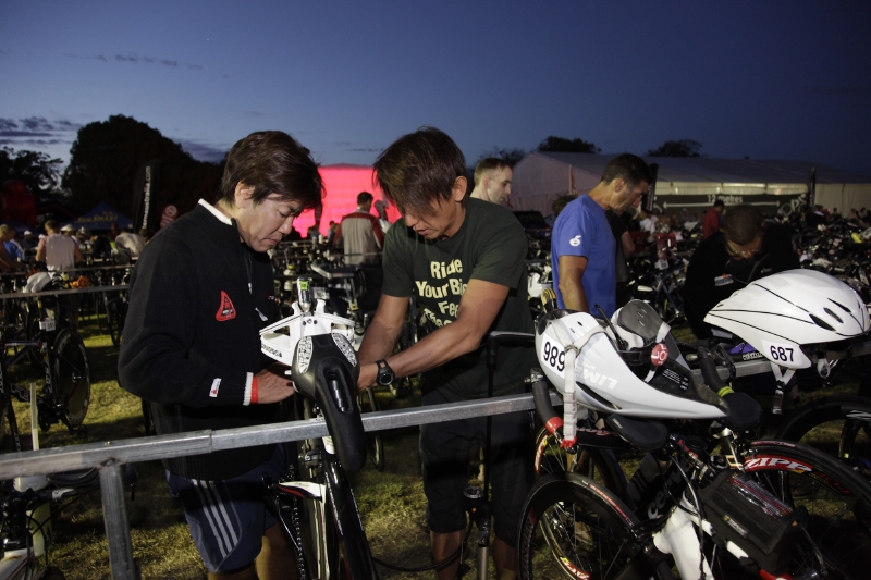 夜明け前のバッセルトンに、アスファルトを擦るシューズの音が静かに響いていた。スイムからバイクへのトランジッションに、出場選手たちが続々と集まってくる。