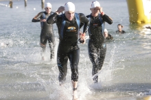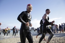 ジェッティが目印になるためミスコースや蛇行の心配は少ないが、コース取りは熾烈だ。 「僕はスイムが得意なので、いつもは先頭集団からスタートするんです。でも、今回は1300人近くが同時にスタートする。バトルに巻き込まれてもしょうがないから、あえて集団の真ん中あたりからいくことにしたんです。3800メートルも泳ぐんだから、ゆっくりいこうぜって思っていたんですけど、それこそ1500メートルぐらいまでバトルが続いたんですよ」