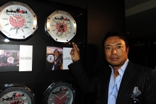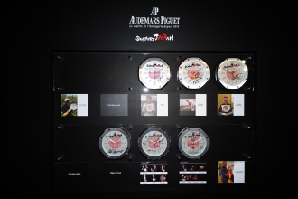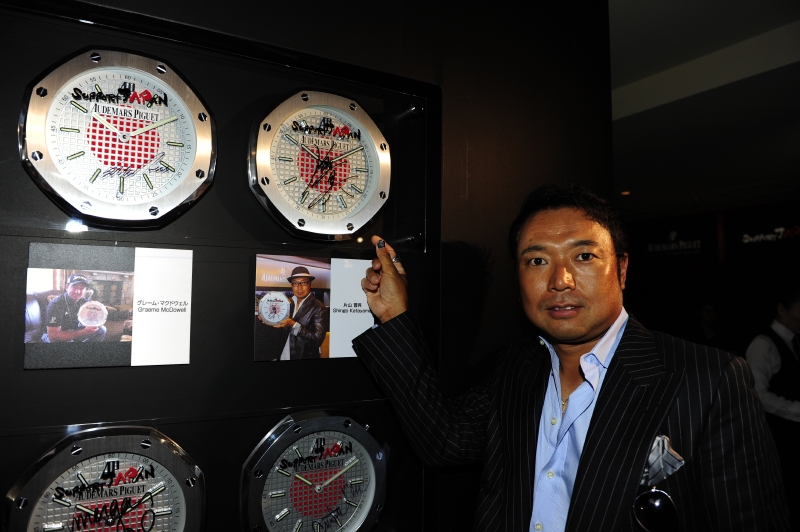 一歩中へ入ると、エントランスからライブフロアに至るまで、ウォールクロックがずらりとかけられていた。それらのオリジナルウォールクロックには、錚々たる面々の直筆サインが記されている。プロゴルファーの片山晋吾氏や青木巧氏、F1ドライバーのミハエル・シューマッハ氏、プロサッカー選手のリオネル・メッシ氏、元K-1世界チャンピオンの魔裟斗氏らをはじめとした総勢40名。これらは全て、ウェブサイト上にてオークションにかけられており、その売上げは東日本大震災の被災地へ寄付される。これはオーデマ ピゲ ジャパンが震災復興支援のために掲げたプロジェクト「SUPPORT JAPAN」によるもの※。