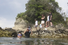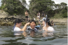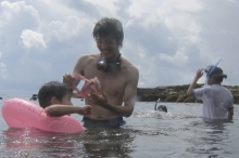 糸見の健闘の末、黒い体に青いラインが美しい、ホンソメワケベラが獲れた。それぞれのチームで、小さな魚から、ヤドカリ、エビなど、思い思いに採取し、海と触れ合う。