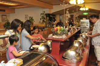 温泉へと向かった子どもたちは、大きな千畳敷の温泉からも海を眺め、露天風呂など、さまざまなお風呂を浴びて楽しんだ。ランチはブッフェスタイル。和洋中のさまざまな料理がずらりと並び、子どもたちはトレイを持って大はしゃぎ。皿一杯に料理を乗せて、健啖ぶりを発揮した。