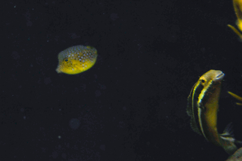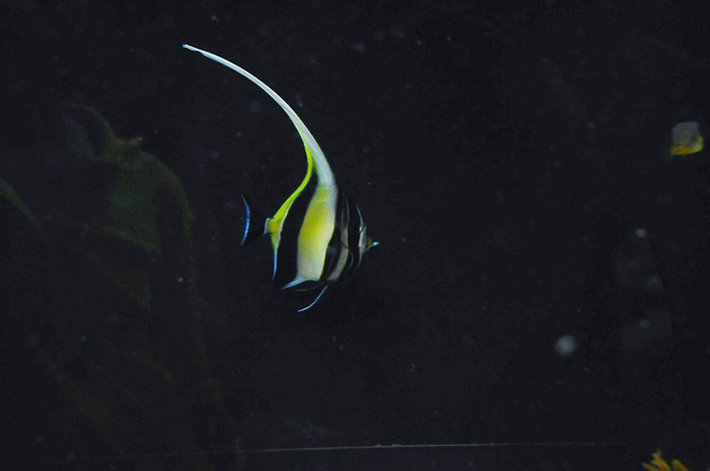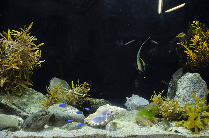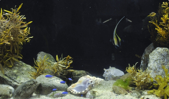 ライトに照らされたアクアリウムは、まるで熱帯の海を切り取ったかのような美しさ。