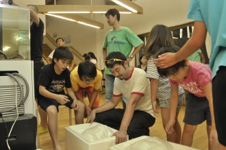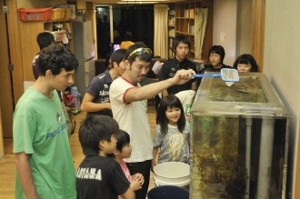 窓愛園に到着すると、早速、ファウスト木村がアクアリウムの調整に入る。今回、残念ながら海に来ることができなかった子どもたちも、少しずつ水槽の前に集まり始めた。