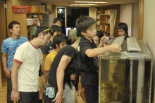 窓愛園にて助けてきたはぐれ熱帯魚を取りだす木村(手前中央)。