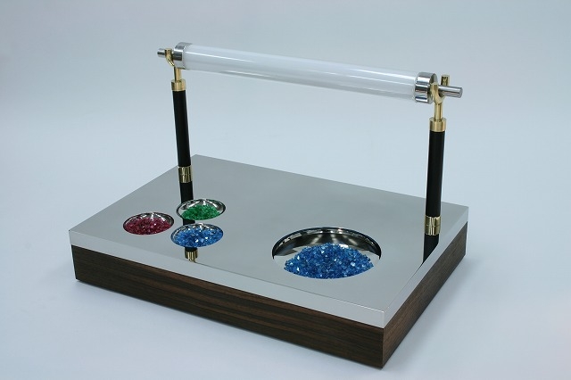 右写真:Starrydust(スターリィダスト)。「価値が無いと思われている」埃と傷に直進する光を合わせた真暗闇の中で使う照明。約100万円(予価)中央写真:Transchromica(トランスクロミカ)。「光をすくう」という概念を表現した照明。すくった色に応じて光が変化するという人とモノとの新しい関係性を実現。約400万円(予価)左写真:Levitice(レヴィティス)。反重力に着目し、「落ちない」という概念を空間の心地よさとして視覚化したプロダクト。約200万円(予価)