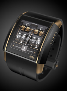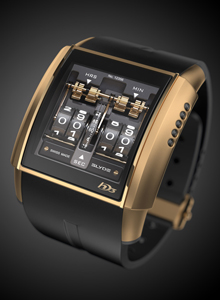 角型の時計ケースの文字盤がスクリーンとなり、各種映像が表示できる。基本的な時計の映像は緻密な歯車などが動き、横一線に何時何分のアラビア数字で表示される。ケース径が57.84×47.71×7.32mm。バッテリーは3.8Vリチウム。(ケース素材により価格は各種)