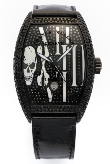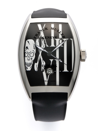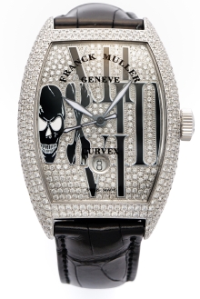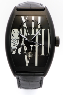 時計本体はフランク・ミュラーが得意とするトノウ・カーベックスと呼ばれるトノウ型で、腕に馴染むカーブ状の形のケースを採用。文字盤には、大きくデフォルメされたローマ数字12時、3時、6時のインデックスが配され、9時のローマ数字がドクロのデザインで大胆に表現されている。また、時計の基本機能はシンプルな中3針で6時位置の上部には丸いデイト表示があり、自動巻き。機能がシンプルだからこそ、ドクロの死生観が浮き立ってくる。