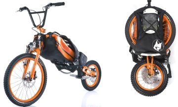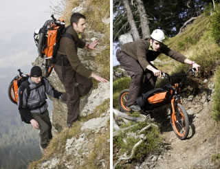 前輪と後輪には制動性の高いディスクブレーキとサスペンションを搭載。前輪を外してフレームを折り畳むと、ご覧の通りバックパックのような状態に。中央のバッグ部分には、ドリンクボトル、携行食、地図といったトレッキング用品を収められる上、ヘルメットホルダーも付帯。製品価格は1500ユーロ前後 (195,000円前後)を予定。