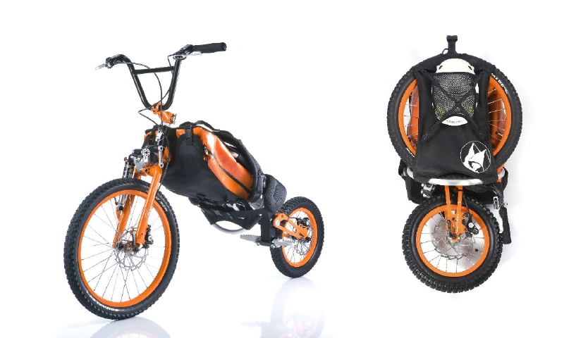 前輪と後輪のサイズが著しく違うほか、一般的なマウンテンバイクと異なる点が多々、目に飛び込んできます。最大の特徴は、折り畳むとバックパックのように背負えること。そう、つまりこのバイクは、折り畳んだ状態で山を登り、山頂に着いたらマウンテンバイクに戻してスリリングなダウンヒルを楽しむ、そんな欲張りな山遊びを可能にしてくれるのです。