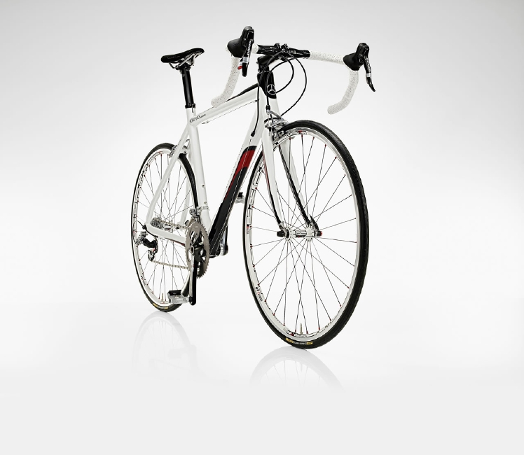 そこで今回取り上げるのは、メルセデス・ベンツの自転車。2007年から機能とデザインともにハイクオリティな自転車を発表しているメルセデス・ベンツは、2009-2010シーズンのコレクションには全6モデルをラインナップしています。まずフィットネスバイク(1099ユーロ)は、スポーツバイクとマウンテンバイクの利点を組み合わせたシリーズで、スポーツ・エディションとコンフォート・エディションの2種類のデザインがあります。前輪とハンドルを結ぶフォークには、衝撃やブレーキを掛けたときの衝撃を和らげるサスペンション機能付き。衝撃を受け止める度合いを示すトラベル量は、マウンテンバイク並みの80mm。また、ストロークを任意に停止するロックアウト機能付きという、これぞクルマメーカーといった機能性と快適さを追求している内容です。フレームのサイズも45cm~54cmの4種類からチョイスでき、デザインはもちろんメルセデス・ベンツのオリジナル。色はファッション性を意識した、ホワイト。街中の移動手段、またトレーニング用の両方にちょうどいいモデルです。