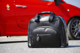 ところでアバルト695トリブート・フェラーリには付属品も魅力的なものが備わってきます。ナポリにある老舗バッグメーカー、トラモンターノ社製のボストンバッグがふたつとオリジナルのボディカバーやレザーの車検証入れ、専用キー&キーホルダーといった品々です。どれもイタリアン・デザインのオシャレなもの。周辺グッズといっても妥協のないクオリティの高いものが選ばれています。