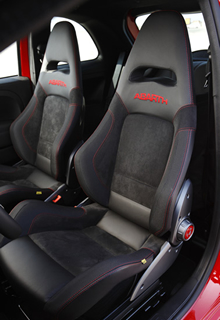 とにかくスポーティなインパネまわり。ステアリングは赤と黒のコンビで、12時のところにイタリアンカラーが施される。また、ダッシュパネルはカーボン調のデカールで覆われる。これがかなりレーシー。