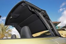 開閉はスイッチひとつのオール電動式で13秒もあれば青空が広がる。Z型に畳まれた幌がボディ内にすっぽり収まるのは、996型以降変わらない。稼働は50km/h以下なら走行中も可能。これヨーロッパ車では常識。突然の雨にあたふたして駐車スペースを探す不便さはない。