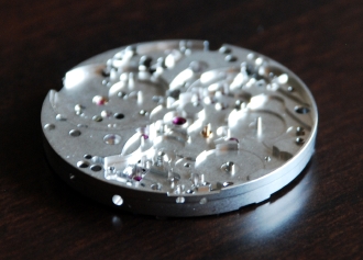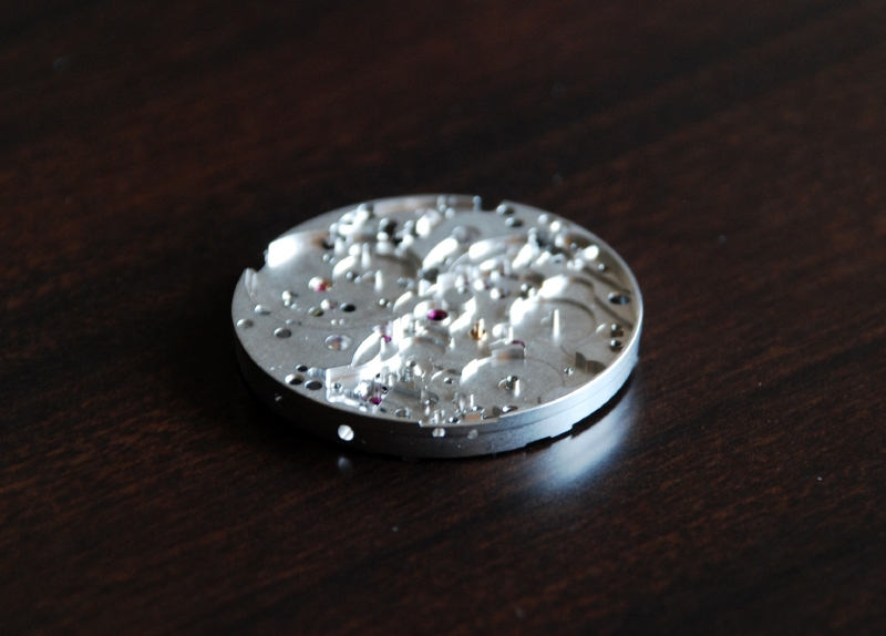 時計のムーブメントには、通常いくつかのブリッジと呼ばれる各種歯車用などの部品がありますが、この時計にはブリッジではなく、ムーブメントのベースである地板に無数の歯車受け用の穴を開けてあることが最大の特徴です。さらに時計ブランドの多くは、汎用性のある既成のムーブメントを使用していますが、今回の新しいモデルは、ムーブメント自体を独自に設計し、既成ムーブメントにはない、多機能時計をより効率よく機能させることが可能になりました。加えてブリッジがないので、時計自体も薄型で美しい時計になっていると思います。