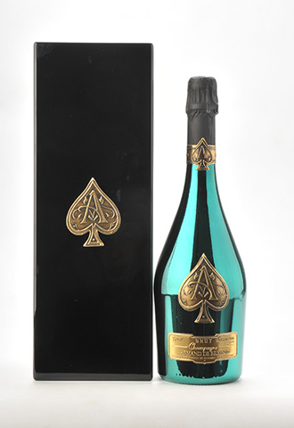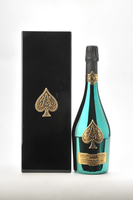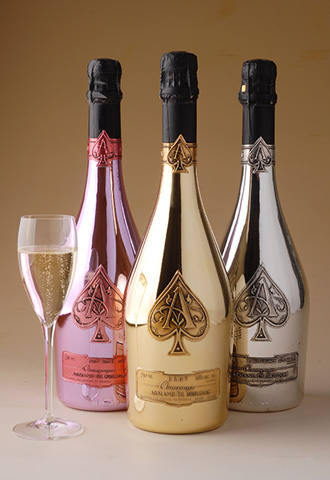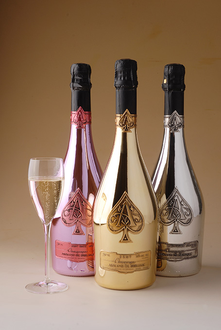 勝利のシンボルとされる輝くゴールドのボトル。アルマン・ド・ブリニャックは特に優れた3つのヴィンテージをブレンドしたマルチヴィテージ・シャンパーニュ。ボディのある芳醇な味わいをもたらす。右側のボトルはマチュザレムと呼ばれる6リットル入りのボトル。通常ボトルの8本分に相当。