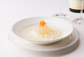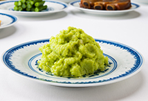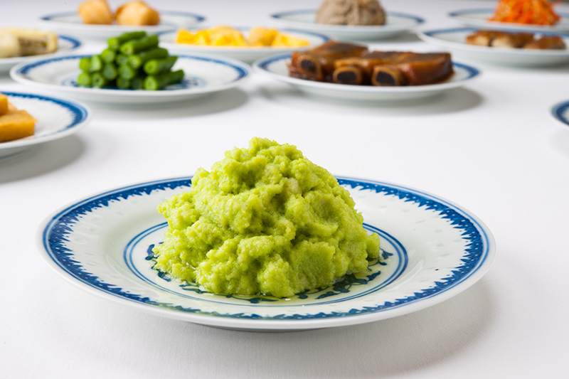 豆腐好きだった西太后は、翡翠(ひすい)をこよなく愛していたことでも有名。青豆とホタテ貝柱を使って翡翠に見立てた豆腐料理は、各コースの前菜で食べられる。全コースとも前菜は20品を提供する。