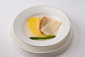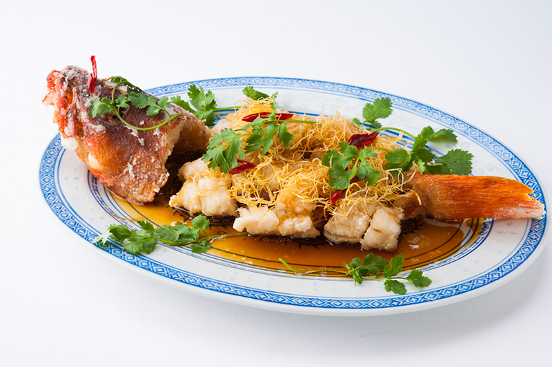 アカハタを丸ごと揚げ、唐辛子を使ったさっぱりした醤油ソースで味を付けた。魚沼産のコシヒカリと一緒に食べる。19世紀にはまだ化学調味料や添加物は存在しておらず、厲家菜でもそれらは一切使用しない。