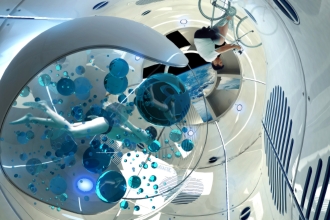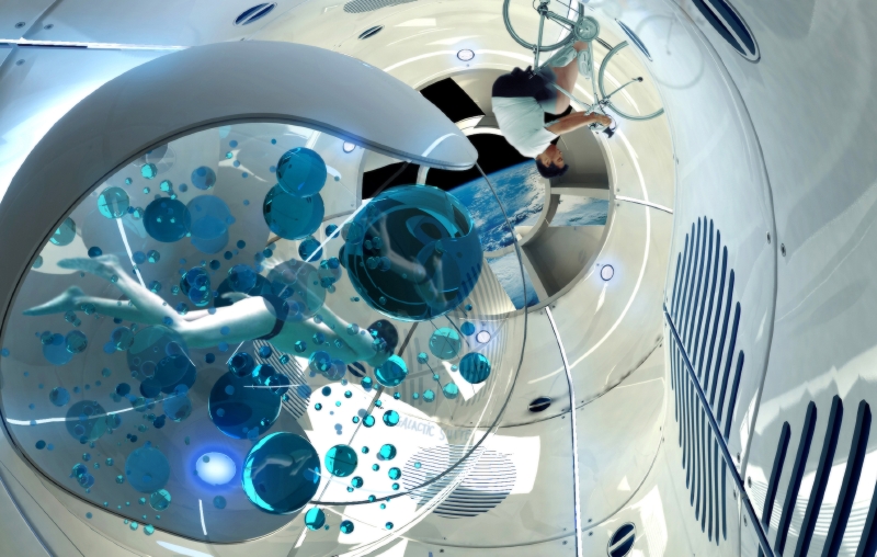 このホテルは、3つのリビング、レクリエーション、食事などが行われる、5つの部屋に分かれています。驚くべきはレクリエーション・スペースで、ランニングマシンなどエクササイズ機器が設置されているほか、なんと浴室もあります。クララムント氏いわく、「無重力環境で浴室をつくることが、もっとも大きな挑戦のひとつ」だとか。研究の結果生まれたのは、直径2mの球体の中に水を入れ、その中に人間が入って楽しむというスタイル。究極のスパを、宇宙空間で体験できるのです。
