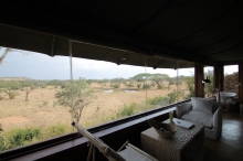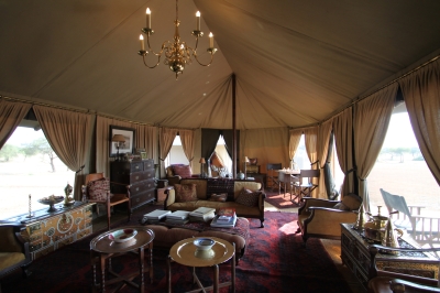 サボラ・テンテッド・キャンプのリビングルーム。大平原の真ん中というワイルドなロケーション。映画『Out of Africa』に描かれた20世紀前半のサファリスタイルを再現。テントタイプの客室が9棟。パブリックスペースもすべてテントスタイルである。