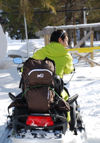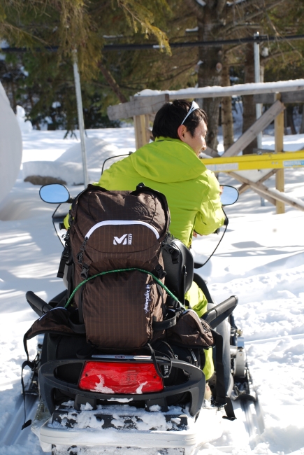 次に、マシンに乗って簡単なブリーフィングを受ける。鍵を回してエンジンスタート。アクセルは右のハンドル、ブレーキは左。バックは白いボタン。走行は基本的にトレイルの右側。右左折や停止の際は腕で合図を。トレイル上の制限速度は時速50km・・・等々。そして実際に雪上での練習走行を数度。これで準備は終了だ。