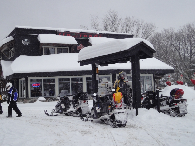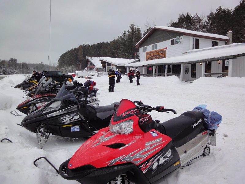 午後1時。出発から3時間ほどで70キロは走っただろうか。ランチのため、パリーサウンドという街の郊外にあるダイナー「ブレイクス・メモリーズ・オブ・マスコーカ」に立ち寄った。駐車場にはスノーモビルがずらり並ぶライダーご用達の店だ。トレイル上には、このようにレストランやガソリンスタンドが点在しており、ツーリングの休憩地点でありライダーたちの交流の場となっている。