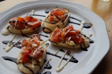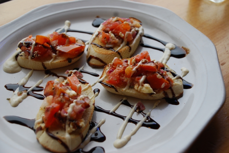 ライダーたちに薦められたメニューは、トマトサラダのブロシェッタと、カナディアン・ハンバーガー。わしづかみでガブリと頬張ると、ダイナミックなうまさだ。