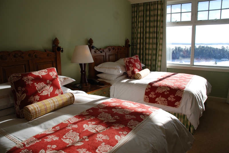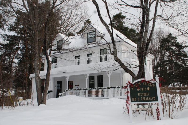 高台のビューポイントに立ち寄って、凍った湖と真っ白な雪世界を眺めたり、ホットチョコレート・ブレイクをしたり、気ままにツーリングしながら、4時過ぎには目的地に到着。今日のステイは、小さなB&B「ルソー・リトリート」だ。